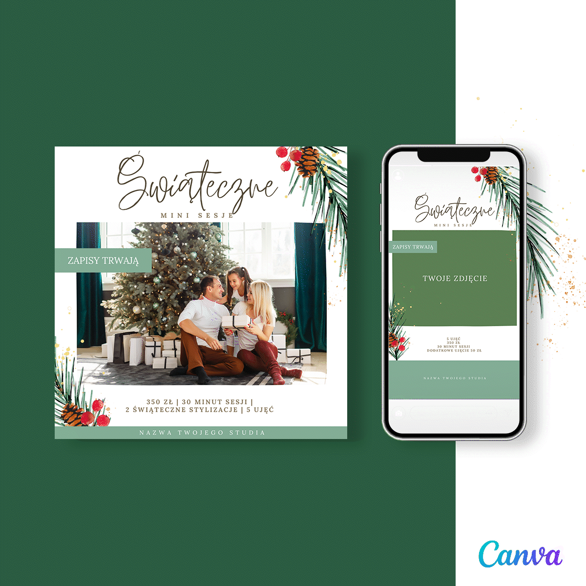 Pobierz gotowe do użycia szablony w plikach PSD! Możesz łatwo wypełnić je własnymi treściami dotyczącymi nadchodzących mini sesji. Zacznij od razu reklamować świąteczne sesje zdjęciowe na swoich stronach!