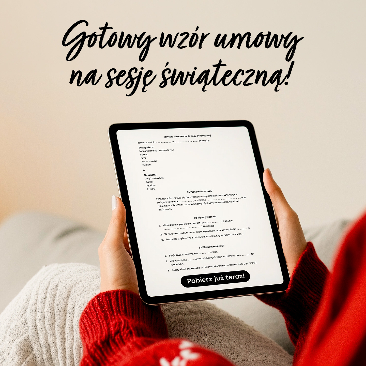 Pobierz wzór umowy na swoje świąteczne sesje, dostosuj go i korzystaj. Dzięki temu działasz profesjonalnie i masz pewność prawnej ochrony – zarówno Ty, jak i Twoi klienci.